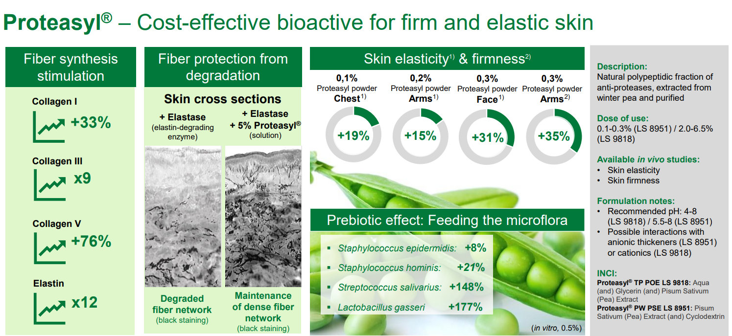Proteasyl™ supports visibly firmer, more elastic skin by protecting and rebuilding key structural elements across all skin layers. It boosts collagen and elastin production, strengthens the dermal-epidermal junction, and enhances epidermal cohesion—reducing inflammation and reinforcing skin resilience against aging.