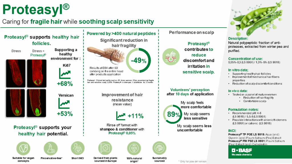 Proteasyl™ now also addresses scalp sensitivity, hair loss, and fragility, with clinically proven efficacy in rinse-off applications like shampoos and conditioners.