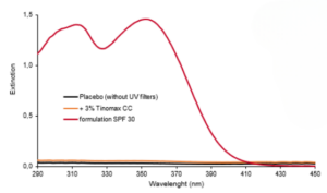 Tinomax™ CC shows no impact on UV light absorption when used without UV filters in formulation.